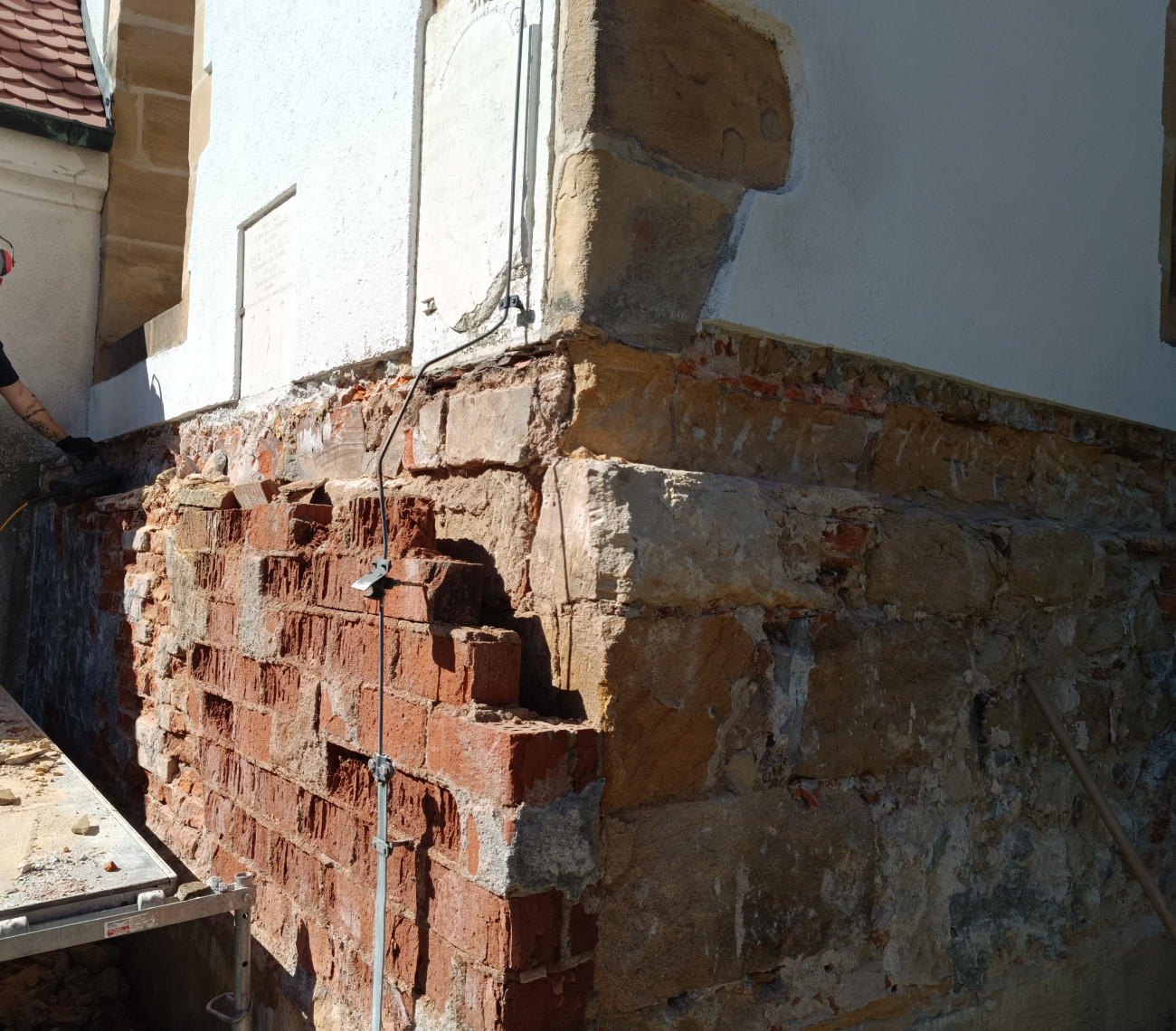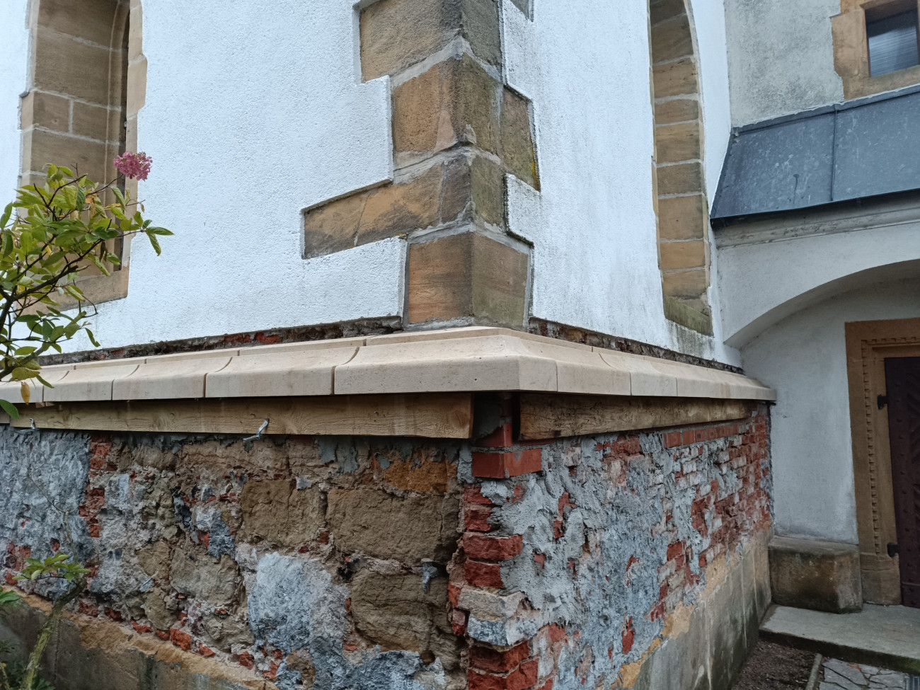 Auch außen sind die Fortschritte sichtbar: Am Kirchturm wurde der alte Putz entfernt, und das Gesimse durch die Firma Frank erneuert. Diese Arbeiten sind notwendig, um die vorhandenen Feuchtigkeitsschäden zu beheben und das äußere Erscheinungsbild des Turms zu sichern.