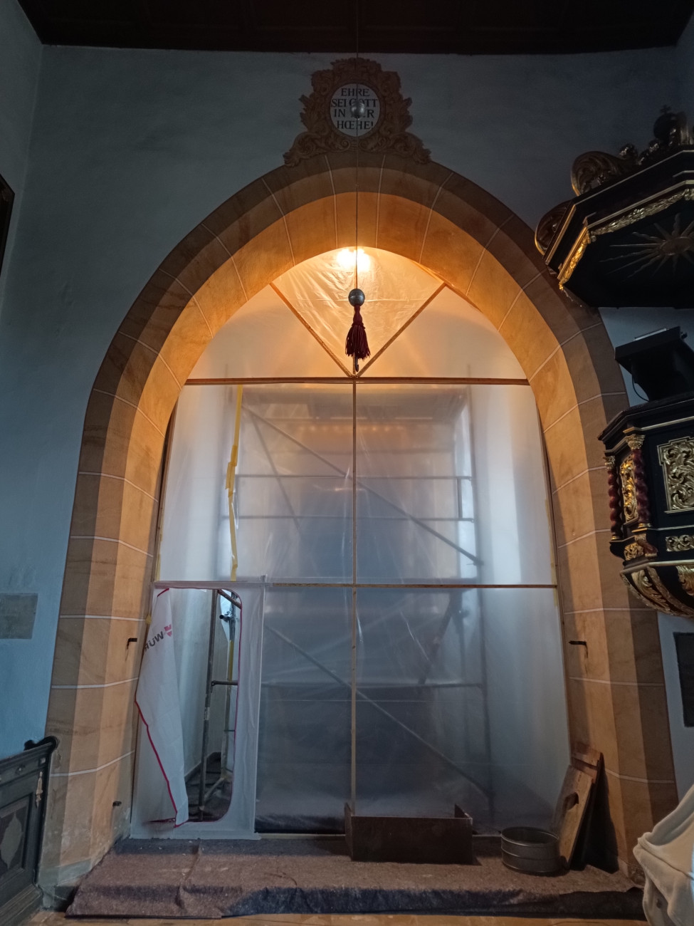 Innen, im Altarraum, wurde der lose Putz abgeschlagen und neu aufgetragen. Während der Trocknungszeit bleibt der Altar, um ihn zu schützen, verhüllt. Unsere Gottesdienste finden aber weiterhin statt, sie werden in dieser Phase vor dem Altarraum gefeiert.